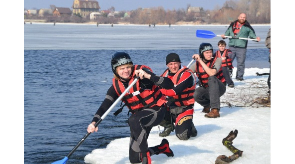 Остальные, надев кошки, запрыгнули на льдину и мы стали думать: чем грести. Вёсел и даже палок на берегу не было, так мы вытащили кастрюли и начали грести. Зрелище было конечно смешное, но мы медленно поплыли. Мы старались держаться ближе к берегу, так, что ежели чего – то могли доплыть до берега.