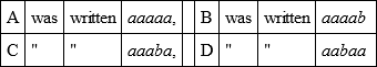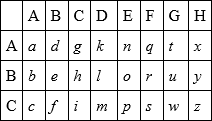 Now suppose that I want to write England; I look among the small letters in the foregoing table for e, and find that it is in a horizontal line with B, and vertical line with B, so I write down BB; n is in line with A and E, so I put AE; continue this, and England will be represented by Bbaeacbdaaaeab. Two letters to represent one is not over-tedious: but the scheme devised by Lord Bacon is clumsy enough. He represented every letter by permutations of a and b; for instance,