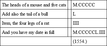 We must not omit to mention Chronograms. These are verses which contain within them the date of the composition. In 1885 I built a boathouse by a lake in my grounds. A friend wrote the following chronogram for it, which I had painted, and affixed to the house: