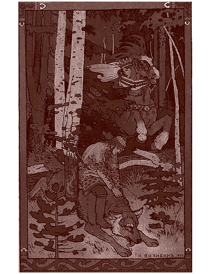 Иван-царевич на сером волке. Иллюстрация И. Я. Билибина. 1899 г. Сказка об Иване-царевиче, Жар-птице и о Сером волке. Рисунки И. Я. Билибина. СПб: Экспедиция заготовления государственных бумаг. 1901.