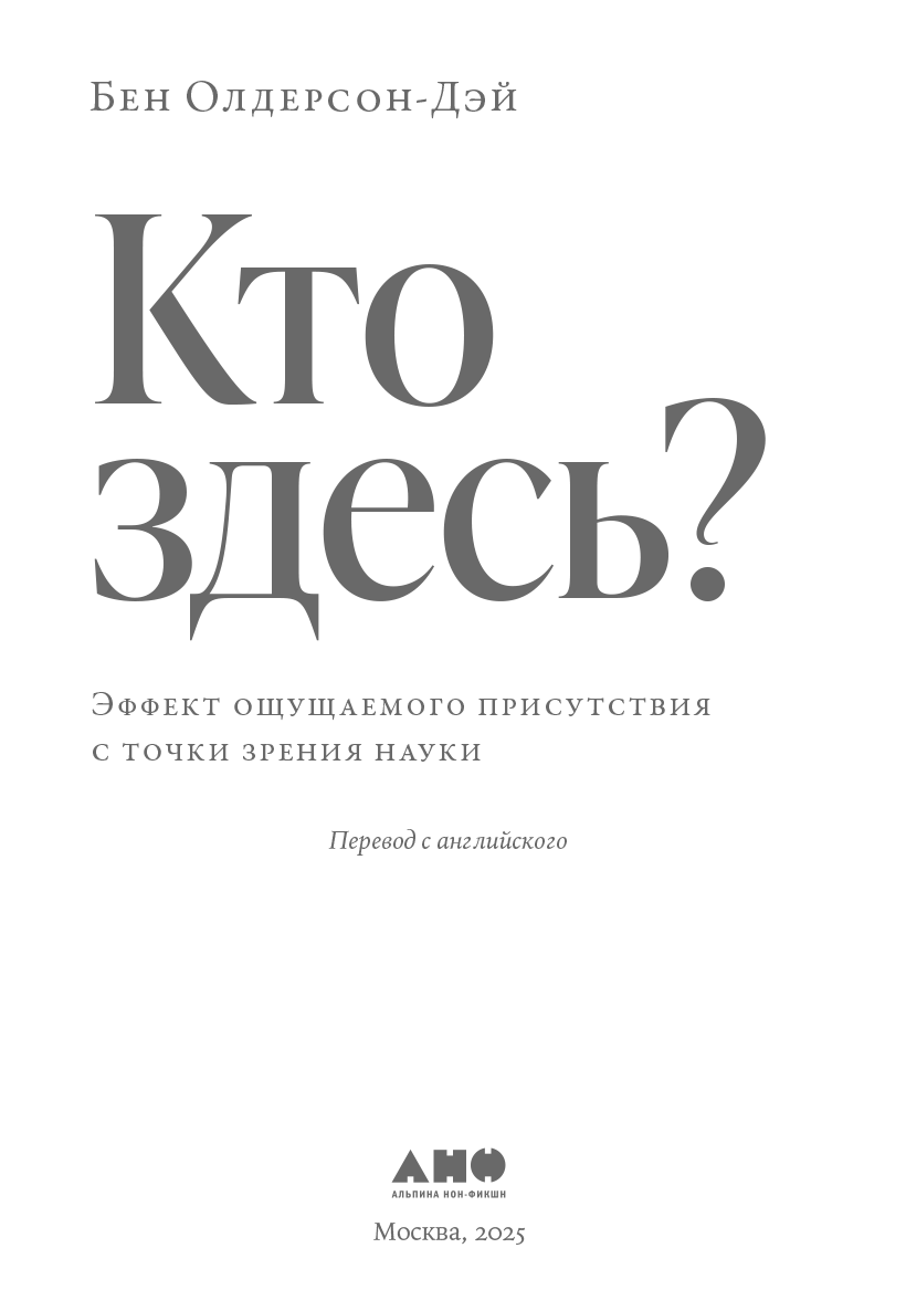 Эта книга – попытка понять, что такое ощущаемое присутствие. Она начинается с разговора о психозе и о голосе, который может присутствовать без звука и слов. Далее мы познакомимся с тем, что такое эпилепсия, лунатизм и воображаемые друзья, повстречаемся с роботами, медиумами и бесплотными духами. Мы узнаем о драматургах, сошедших с ума от вдыхаемых паров ртути, о ночных гостях, которые могут напугать человека буквально до смерти, и о безмолвной фигуре, способной одним прикосновением остановить сердце.