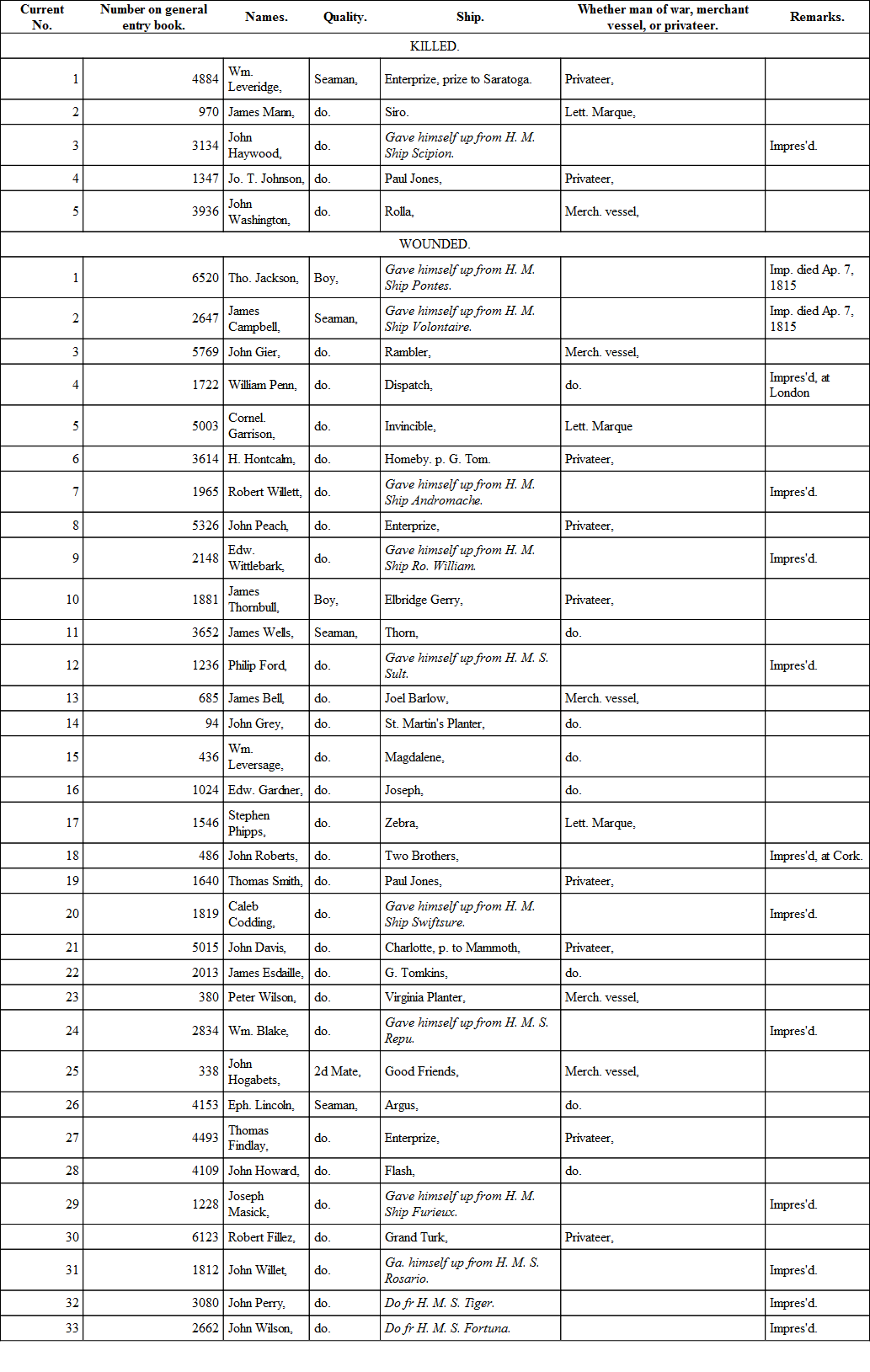 A Return of American prisoners of war killed and wounded in an attempt to force the military guard on the evening of the 6th of April, 1815.