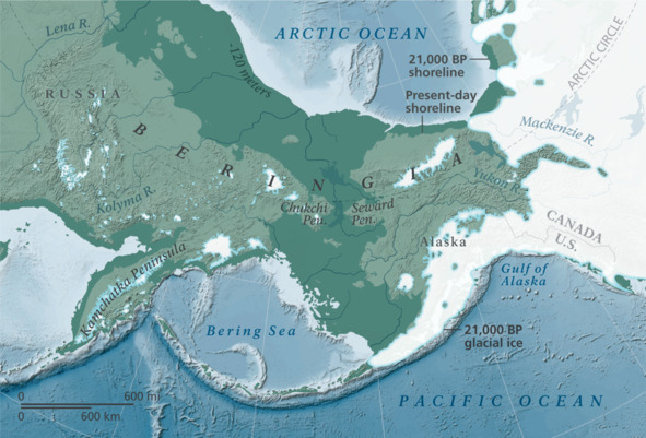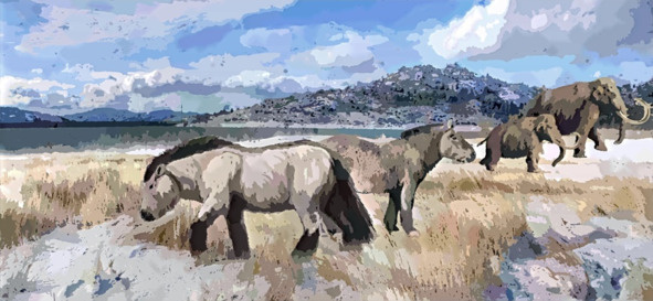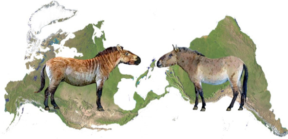 Около 2 млн. лет назад, вновь появился огромный участок суши – Берингия, быстро заполнившийся высокими питательными травами и редкими деревьями, куда и устремились многие травоядные. В это же время, предки человека научились бродить целыми днями по саваннам, превратились из homo habilis в homo erectus, и осуществили первый выход человека из Африки. Таким образом, лошади и люди появились на территории Евразии почти одновременно, но с разных сторон. Берингия имела огромную территорию: ее ширина была от 2000 до 3000 километров, а площадь вдвое превышала современный Техас! Палеонтологи находят гигантское количество костей лошадей и других травоядных в прилежащих к ней зонах Аляски и Сибири, что говорит о том, что во все времена Берингия становилась домом для животных, ничуть не менее привлекательным, чем Великая степь или американские прерии. Людям, как выходцам из тропиков, Север кажется не слишком приятным для жизни, но для тех животных, которые сформировались в средней полосе, при более холодных условиях, жизнь в районе ледяного щита не казалась чем-то ужасным. Наоборот, лошади, северные олени, даже африканские слоны гораздо хуже переносят перегрев, чем холод. Это сейчас Берингов пролив представляет собой склонную к штормам полосу воды шириной 86 километров, которая разделяет два континента, во времена же оледенения, особенно, в летнее время, Берингия превращалась в цветущий сад, закрытый от всех невзгод горами Аляски и Камчатки, и массивным ледником на севере. И по сей день этот регион один из самых богатых по количеству видов морских обитателей.