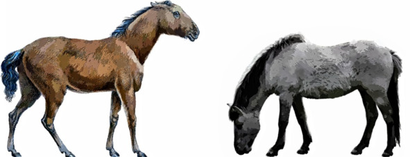 Часть гиппарионов начала подстраиваться под новые условия жизни в районе лесов, но внезапное похолодание после температурного всплеска и осушение лесов, не позволили приспособиться ни к жизни в степях, ни в лесах, что окончательно их добило. Шанс на выживание получила лишь небольшая группа потомков степных гиппарионов – диногиппусов. Здесь у них не было конкурентов, а гигантские хищники не успевали плодиться с такой скоростью. Диногиппусы и стали прямыми предками современных лошадей. Ранние equus (далее просто «лошади») состояли из трех подвидов, один из которых внешне почти не отличим от своих предков, и известен как equus simplicidens или Американская зебра. Она, действительно, имела зеброидные полоски на ногах и теле, толстую шею, способную выдержать укус хищника или сородича, и короткую голову, наподобие ослиной, прямую торчащую гриву, и короткий и жесткий хвост. Но вот мозг у них был несколько больше, чем у диногиппуса.