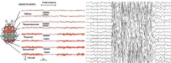 Умные не живут крупными стаями. Это очень наглядно видно по ЭЭГ работы мозга. Слева ритмы здорового человека в покое – в нем всегда очень много разных волн, каждая часть мозга работает независимо, каждая занимается собственным делом. А вот справа «в едином порыве» показан приступ эпилепсии, в котором нет разумных действий, есть лишь бездумная активность в единстве, разрушающая организм и приводящая к его недееспособности. Впрочем, это крайний случай скоррелированности. Подобным образом возникают болезни, катастрофы, изменения климата, разрушительные последствия массовых помешательств вроде движения хунвейбинов в Китае, драки спортивных фанатов и т. д. Но при небольшой дозе скоррелированности возникают и свои плюсы: воздействуя на один элемент, вы можете воздействовать и на все остальные. Этим успешно пользуются медики, леча пожилых людей, у которых уже все системы организма начинают ослабевать, давать сбои и «синхронизируются». Точно также на занятиях и семинарах я советую не упрямо добиваться своей цели, а «скоррелировать» разные условия и элементы так, чтобы все получалось как бы само собой. Имея некоторый уровень синхронизации с лошадью или с другом, вы начинаете понимать друг друга буквально «на дыхании». Заметьте, что у бодрствующего человека, альфа-ритм практически отсутствует, потому что это ритм «пустых сенсорных входов», когда организм как бы прислушивается, ища новые сигналы. Тоже самое происходит при медитации или в «состоянии мастера», когда мозг избавляется от восприятия привычных сигналов, сознание игнорирует засевшие в голове идеи, и человек пробует уловить новые непривычные в окружающем мире или в себе. Они позволяют достичь другого уровня синхронизации, который будет полезен при взаимодействии с лошадью.