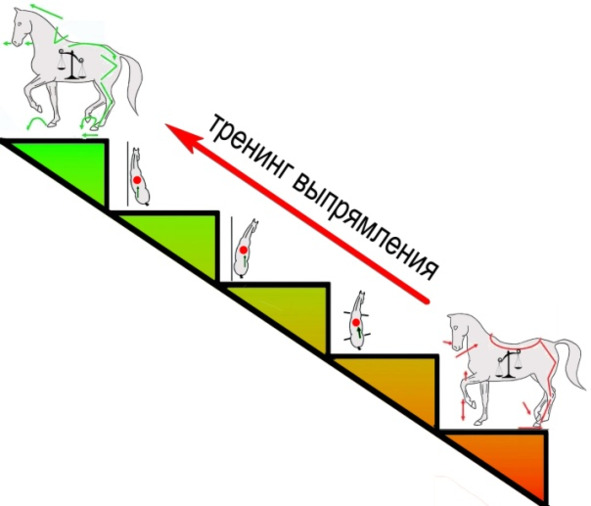 Straightness training был создан Марайкой де Йонг на основе упражнений Высшей школы. Сейчас ее последователи улучшили это направление, исключив опасные упражнения, но оставив неизменной суть метода. Тренинг выпрямления – вещь неспешная и вдумчивая, удерживающая концентрацию на движении и на балансе лошади на протяжении всего занятия. Даже человек не может долго концентрироваться на одном, что уж говорить о лошади, особенно если мышцы не подготовлены! Первые занятия длятся всего несколько минут. Мне это напоминает тренинг опытных бодибилдеров, которые не стремятся к большим весам или тренировкам по часам. Главное – ощутить правильное движение, прочувствовать траекторию и распределение нагрузки. Вы контролируете не вес, а ведете диалог со своим телом. Стремление же взять большой вес или ориентация «я выдержу, я смогу» – это тренировка Эго.