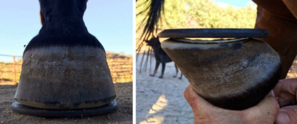 Давайте проведем еще одну аналогию из конного мира – ковку лошадей. В чем здесь неприятная правда? В том, что реальная цель – не здоровье лошади, а уничтожение чувствительности к агрессивному влиянию грунта. И обеспечение финансового благополучия коваля, который будет расписывать все преимущества данного подхода просто потому, что он стоит дорого, а он не знает или не хочет лечить по-настоящему. Протез, знаете ли, вещь прекрасная, и может быть даже высокотехнологичная, но это не повод отрезать настоящий орган и заменять его искусственным. Впрочем, качественная маскировка проблемы обычно снимает вопрос о необходимости понимания многих вещей, связанных с функционированием копыта. На данном фото можно четко увидеть разницу между копытом, расчищенным с учетом его физиологических и физических характеристик, что напоминает копыто мустанга. сточенное естественным образом, и формой подковы, которая разрушает весь смысл данного органа.