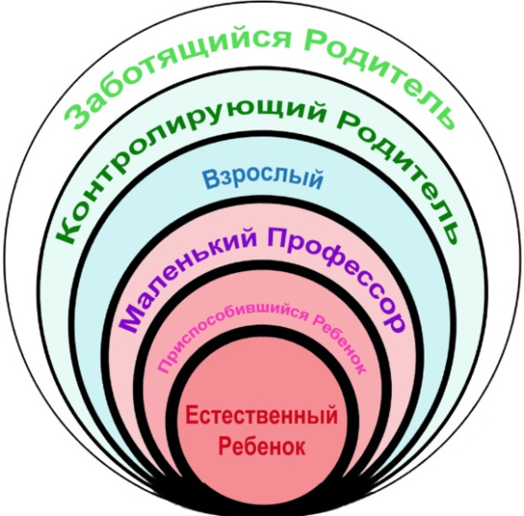 Как мы помним, согласно Эрику Берну, существует три состояния Я: Родитель (Контролирующий и Заботящийся), Взрослый и Ребенок (Естественный, Приспособившийся и Маленький Профессор). Эти состояния Я формируются по мере накопления опыта общения с другими. Родитель – это установки, шаблоны поведения, догмы, Взрослый – холодный аналитик, а Ребенок – это и хаос первичных потребностей (вечное «хочу»), и адаптация к условиям («надо, так положено») и детские фантазии в стиле Гарри Поттера. А поскольку опыт формируется во времени, и чем он более свежий, тем менее проверенный и надежный, то и состояния Я, чем выше, тем менее устойчивы. Поэтому их можно представить в виде оболочек личности, где в центре будет Естественный Ребенок, а с краю Контролирующий Родитель.
