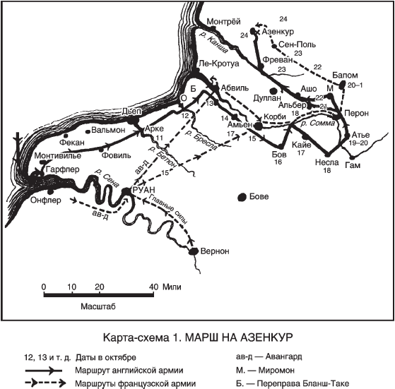 Маршрут похода английской армии нетрудно установить достаточно точно. Можно рассчитать и скорость движения армии, если условиться о дате ее выступления в поход. Я принял дату, приведенную в «Хронике Лондона», – 8 октября.