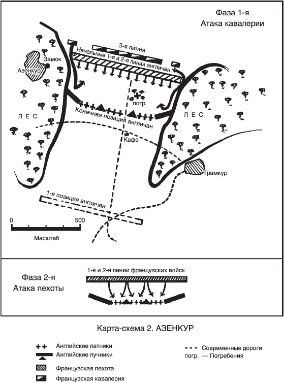 Все авторитетные исследователи соглашаются в том, что, когда основные силы завязали бой с англичанами, они находились в таком стесненном положении, что воины не могли пошевелить руками, чтобы воспользоваться своим оружием. Как это вышло? Разве они могли на самом деле построиться в такой тесный боевой порядок? Полагаю, столь неблагоприятному и фатальному исходу для французов способствовали две причины. Взгляните на карту, и вы заметите, что ширина поля на французской стороне была на 150 ярдов больше, чем на английской. По мере того как французы наступали, ширина фронта для них уменьшалась из-за того, что два лесных массива сужали поле в центре, подобно воронке. Это и стало фактором уплотнения французских боевых рядов в ходе их наступления.