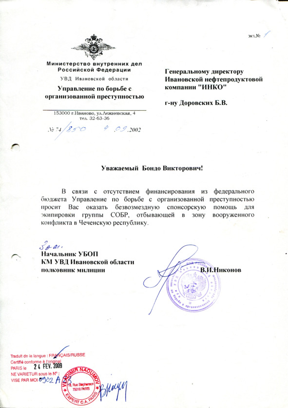 Запрос с УБОП КМ УВД Ивановской области, 2002 год.