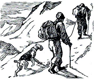 Чем выше, тем труднее подъем, круче, неприступнее обледенелые скалы. Приходилось вырубать во льду ступеньки, вбивать железные крючья. Метеоролог начинал подумывать о том, что совершил большую оплошность, взяв с собой собаку.