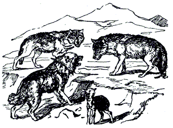 Поставив ягненка на ножки, загородив его собой, он обернулся к приближающейся стае и приготовился к битве. Тело его напряглось, чуть осев назад, шерсть вздыбилась, глаза засверкали диким блеском. Оскалив смертоносные клыки, он издал громкий отрывистый не то лай, не то вой. Это был его боевой клич, предупреждение врагам, что схватка будет не на жизнь, а насмерть. Грозный голос его разнесся по ущелью и замер в отдалении.