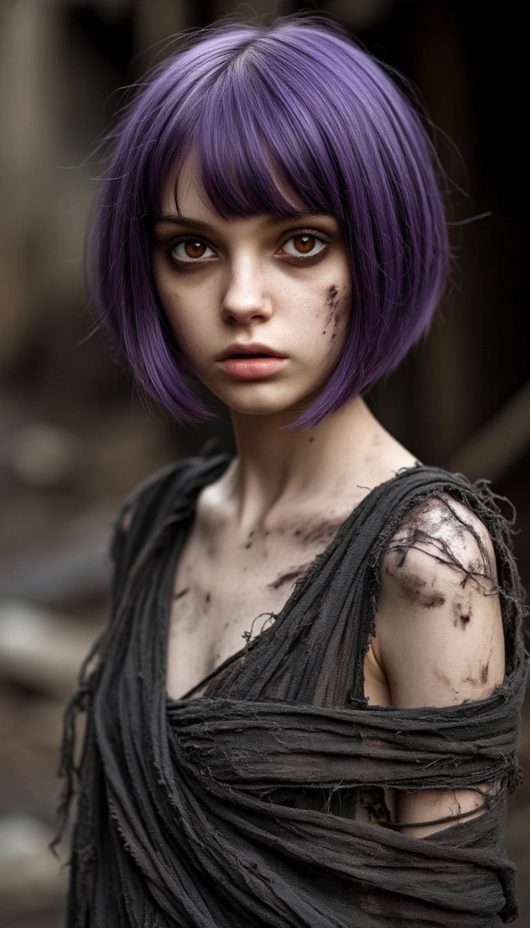 "Тише… тише…" – я почувствовала, как чьи-то костлявые руки с усилием приподнимают меня, помогая сесть. Ноющая боль в ноге тут же напомнила о себе, пронзая все тело острой, обжигающей вспышкой. Я резко обернулась, стараясь подавить стон. Передо мной сидела очень худая девушка, с аккуратным фиолетовым каре, которое, казалось, было единственным ярким пятном в этом мрачном месте, и огромными, испуганными карими глазами, в которых плескалось сочувствие. Ее хрупкое тело было обмотано в какие-то грязные, черные тряпки, еле прикрывающие грудь и таз. На коже виднелись следы старых шрамов и синяков, рассказывающих о непростой судьбе. Видя мой растерянный, испуганный взгляд, она тихо произнесла: