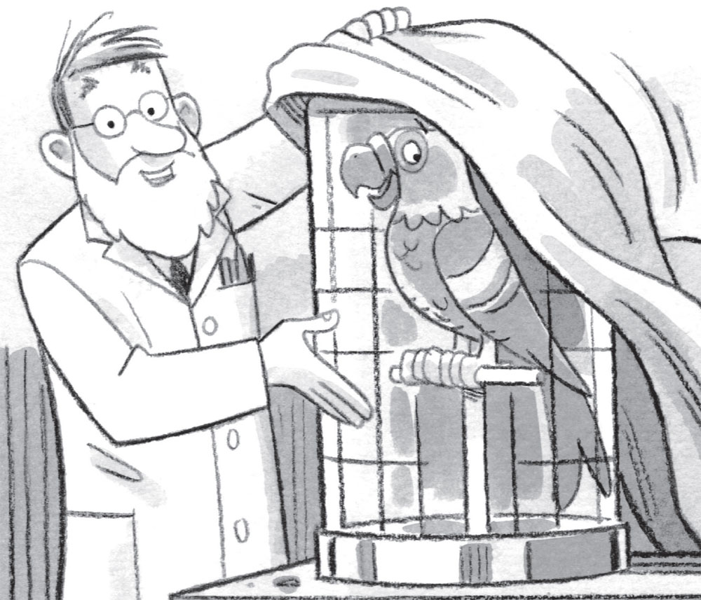 A bearded man entered, wearing a white coat and carrying a birdcage with a cloth over it. Bowing, he removed the cloth to reveal a large, brightly-coloured parrot.