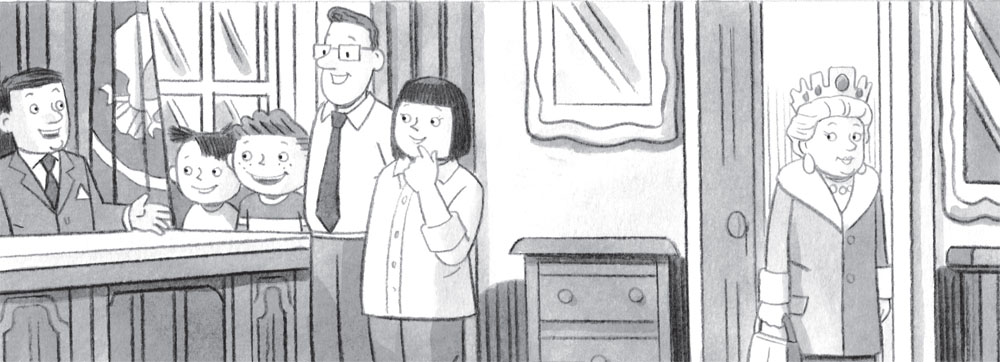 A side door of the Oval Office had opened suddenly to reveal a nicely-dressed lady wearing a crown. Mrs Lambchop recognised her at once as the Queen of England.