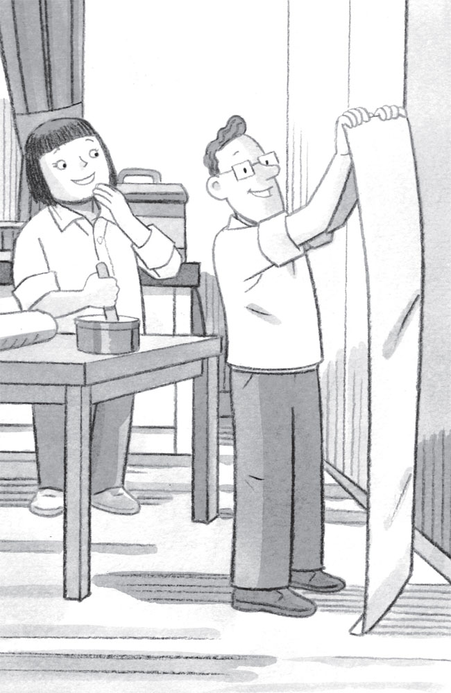 It was Saturday morning, and Mr and Mrs Lambchop were putting up wallpaper in the kitchen.