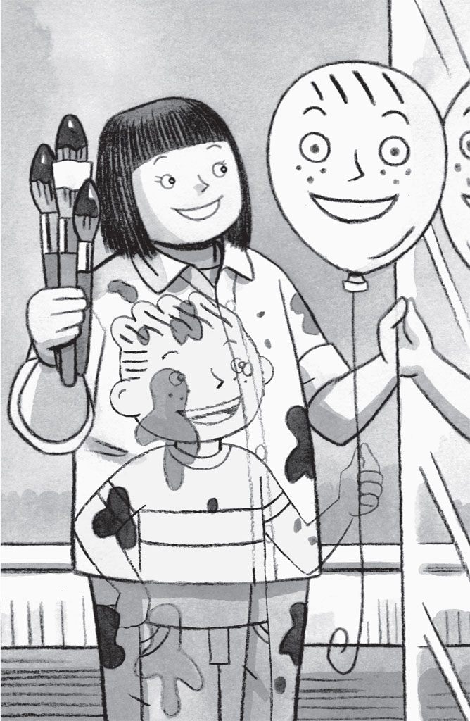 But after dinner, Mrs Lambchop, who was artistically talented, replaced the red balloon with a pretty white one and got out her watercolour paints. Using four colours and several delicate brushes, she painted an excellent likeness of Stanley, smiling, on the white balloon.
