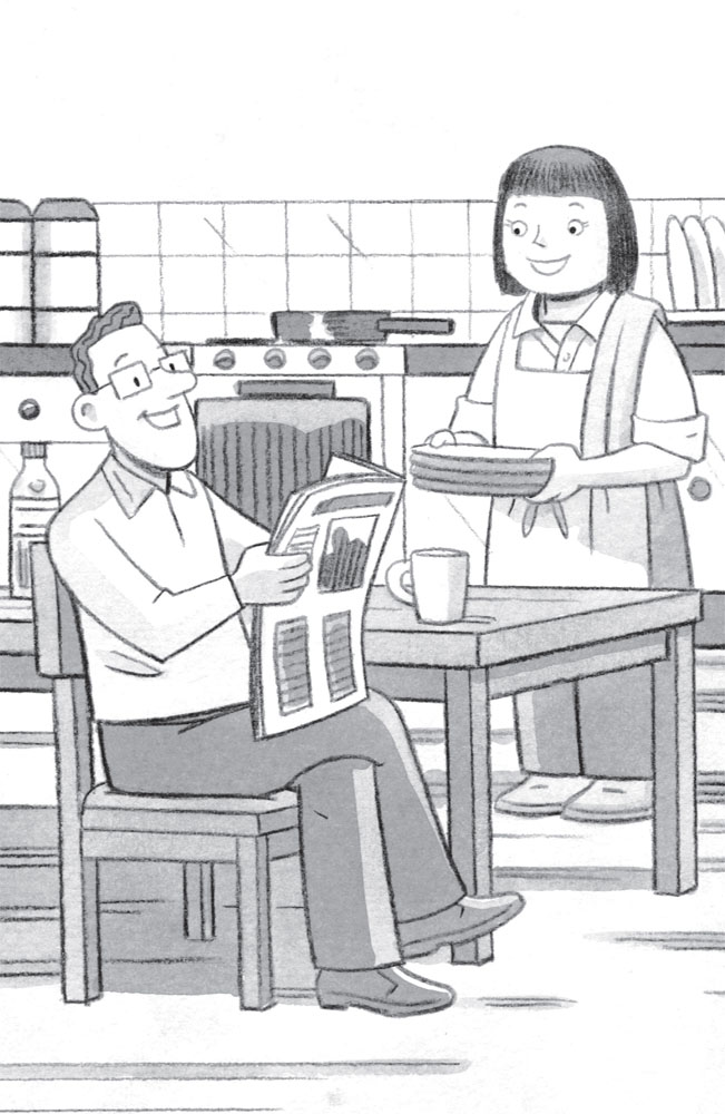Mrs Lambchop was making breakfast. Mr Lambchop, at the kitchen table, helped by reading bits from the morning paper.