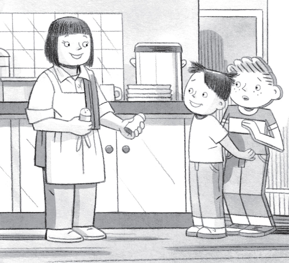 Her glance fell upon a row of photographs on the wall above the sink. There was a smiling Stanley, only half an inch thick, his big bulletin board having fallen from the bedroom wall to rest upon him overnight. Next came reminders of the many family adventures that had come after Stanley’s younger brother, Arthur, had cleverly blown him round again with a bicycle pump. There were the brothers with Prince Haraz, the young genie who had granted wishes for them all after being accidentally summoned by Stanley from a lamp. There was the entire family with Santa Claus and his daughter, Sarah, taken during a Christmas visit to the North Pole. There was the family again in Washington, DC, in the office of the President of the United States, who had asked them to undertake a secret mission into outer space. The last picture showed Arthur standing beside a balloon on which Mrs Lambchop had painted a picture of Stanley’s face. The balloon, its string in fact held by Stanley, had been a valuable guide to his presence, since he was invisible at the time. ‘Boys!’ she called again. ‘Breakfast!’