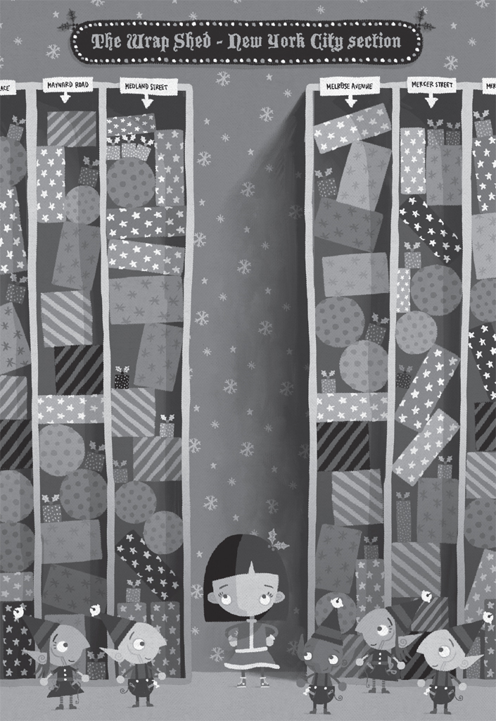 In the Wrap Shed the gifts lay ready, wrapped now in gay paper with holly and pine cones, sorted by country, by city or village, by road or lane or street.