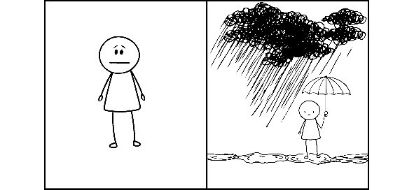 Возьмите лист бумаги и разделите его пополам вертикальной черточкой. Для начала нарисуйте просто человечка. Не нужно соревноваться с маститыми художниками, рисуйте как умеете. Главное, чтобы в картинке были выражены смыслы, которые вы считаете важными. На второй половинке листа нарисуйте человечка под дождем.
