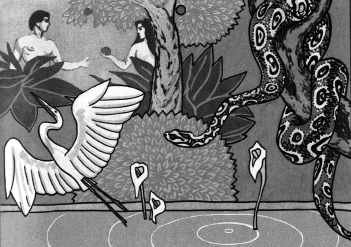Однажды змей, в которого вселился дьявол, спросил Еву, почему они едят плоды не со всех деревьев. Она ответила, что Бог запретил им есть плоды с дерева, которое растет посередине сада, иначе они умрут. Змей сказал ей:
