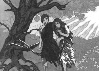 Когда же Бог гулял по саду, Адам и Ева спрятались за деревьями. Бог стал искать и звать Адама: