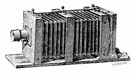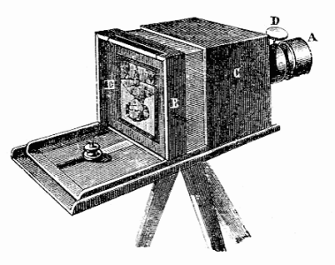 Позднее Порта изготовил прибор несколько иного рода, основной принцип которого сохранился до настоящего времени. В деревянный ящик произвольной величины, но почти всегда продолговатый, вделана медная труба, содержащая собирающее стекло, носящее название объектива. Внутри этого «внешнего» ящика движется взад и вперед другой, меньшей величины, заднюю стенку которого составляет матовое стекло. На нем и получается изображение фотографируемого предмета в перевернутом виде. Впереди матового стекла находится подвижная перегородка, при задвигании или опускании которой изображение на стекле исчезает. Весь прибор устанавливается на штативе, который устроен так, что камеру можно поворачивать во все стороны, желая направить объектив на избранный для получения изображения предмет.