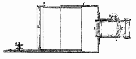 Описанная нами камера-обскура, употребляемая для светописи, имеет и другой вариант устройства корпуса, предложенный французским оптиком Дерожи. Вместо двигающихся один в другом ящиков корпус этой камеры-обскуры устроен наподобие гармони или раздувательных мехов. Такой корпус имеет с одной стороны доску, в которую вставлена трубка объектива, а с другой – раму с матовым стеклом. Корпус этот движется взад и вперед по рейкам и в случае надобности может быть укреплен неподвижно при помощи особых винтов.
