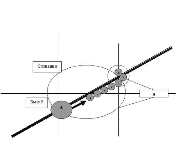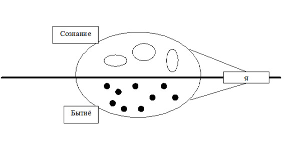 В нижней половинке – всё, что мы обычно относим к нашему БЫТИЮ. Здесь вся поступившая к нам энергия впечатлений – сигналы всех наших органов чувств, все алгоритмы их первичной обработки, все двигательные стереотипы, то есть весь внешний мир в той форме, в которой мы его воспринимаем.