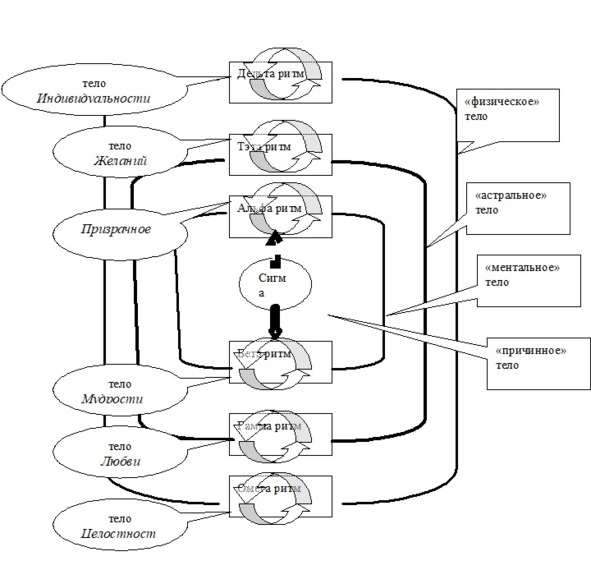 В данном случае энергетическая структура человека представляет собой ряд вложенных друг в друга восьмёрок, каждая из которых исходит из области Сигма ритмов, из ВОЛИ человека. И каждая из них обладает не только БЕССМЕРТИЕМ, но и способностью к постоянному развитию. Так, если нам удалось сформировать «восьмеричное ментальное» тело, то мы можем не только довести его форму до совершенства, но и начать формировать «восьмеричное астральное» тело и так далее. И на этом пути нет силы, которая может противостоять человеку, или контролировать его.