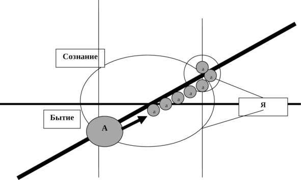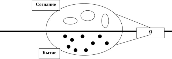 В нижней половинке – всё, что мы обычно относим к нашему БЫТИЮ. Здесь вся поступившая к нам энергия впечатлений – сигналы всех наших органов чувств, все алгоритмы их первичной обработки, все двигательные стереотипы, то есть, весь внешний мир в той форме, в которой мы его воспринимаем.
