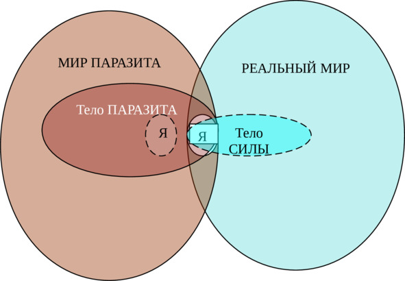 Каждый шаг, направленный на развитие ТЕЛА ПАРАЗИТА, развитие способностей ПРОИЗВОДИТЬ ВПЕЧАТЛЕНИЕ отделяет человека от реального мира и от реальной СИЛЫ. В конце концов, его «я» оказывается полностью погружено в Буферную зону (в МИР ПАРАЗИТА) и он просто не можем осознать, что за её пределами есть что-то ещё. То есть любая сила, любая способность становится для него реальной лишь в том случае, если ему удастся убедить в её существовании окружающих его людей. И именно это становится главным и конечным результатом всех его действий.