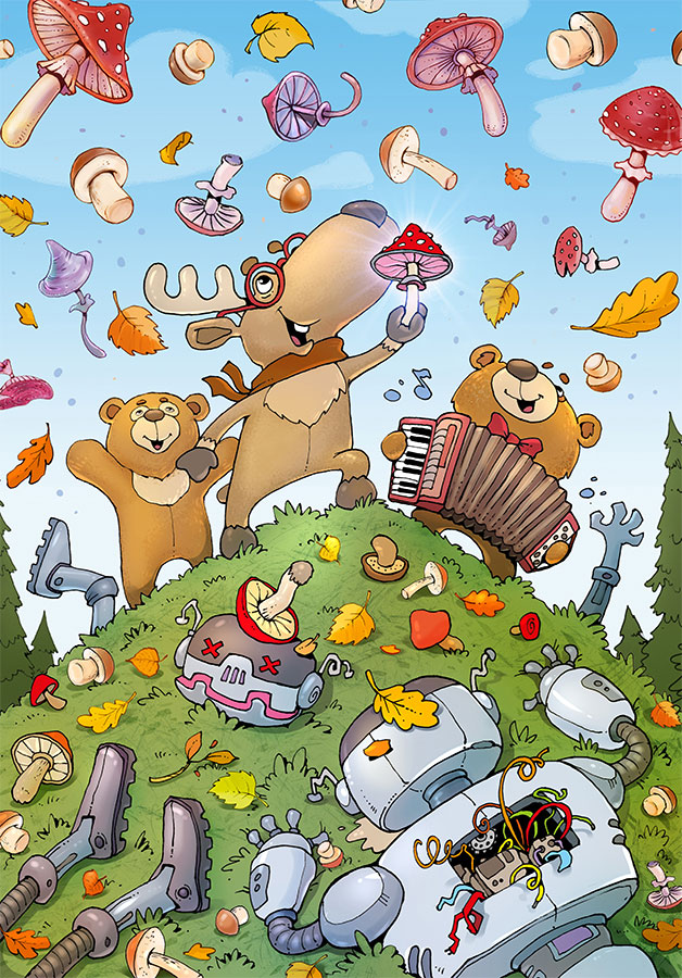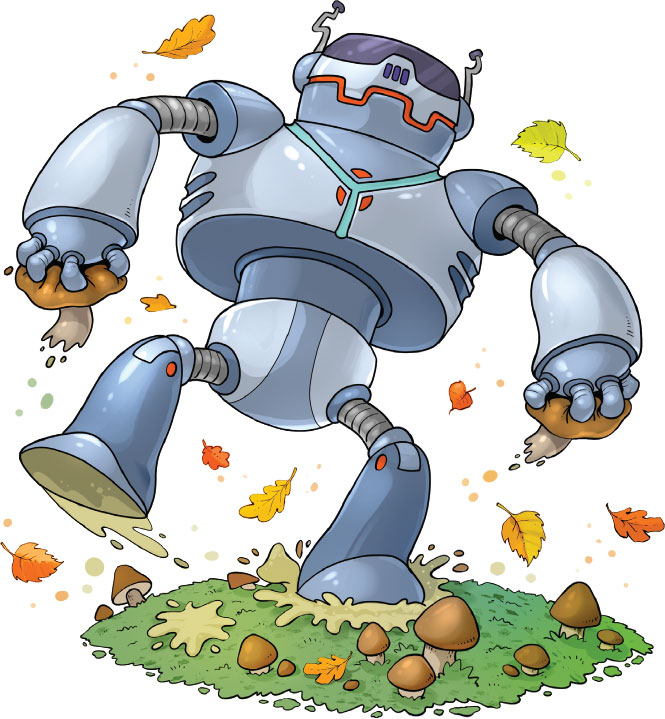 Лесные звери дружно заслоняли лося Ермолая с маленьким мухомором в лапах. Сократ с ужасом осознал, что роботы уже совсем близко. И тут… его осенило!