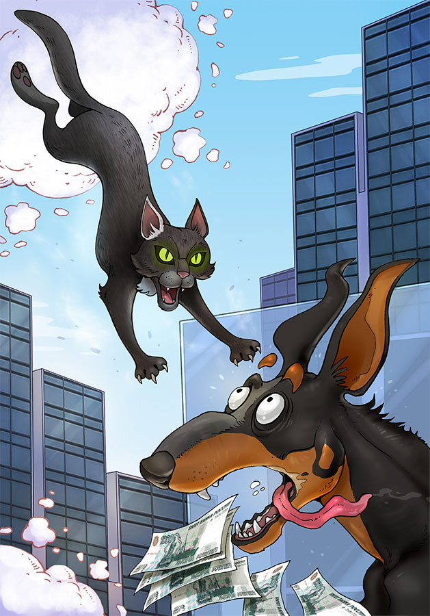 Мара выскочила из штаба, оттолкнулась посильнее от облака и, рассчитав траекторию прыжка, полетела вниз. В тот момент, когда Доберман выскочил из крутящихся дверей, он лишь успел боковым зрением заметить приближающиеся к его шее острые когти. От удивления и страха Доберман разжал пасть, деньги выпали. Острые когти впились в шкуру. Пёс взвыл и побежал наутёк. Человек, увидев происходящее, замер в недоумении с широко раскрытыми глазами. Деньги валялись на тротуаре. Человек их поднял.
