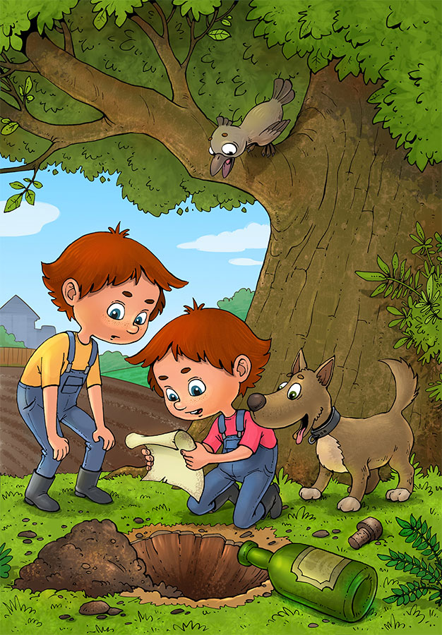 Как-то раз братья работали в огороде, а Геракл рылся под раскидистым старым деревом. Вдруг пёс громко залаял. Он так делал всегда, если находил что-то интересное. Мальчики бросили лопаты и подбежали к Гераклу. Из земли торчало дно старинной бутылки. Джон и Кевин быстро откопали находку. Тёмно-зелёное стекло, старая пробка, затыкающая горлышко. Кевин несколько раз встряхнул бутылку. Внутри что-то было. Он с трудом вытащил пробку. Внутри оказался бумажный свёрток. Он развернул его и прочитал вслух: