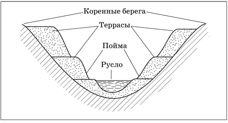 Части реки: исток – место, где река берет свое начало. Истоком может быть родник, озеро, болото, ледник в горах; устье – место впадения реки в море, озеро или другую реку. Понижение в рельефе, тянущееся от истока до устья реки – речная долина. Углубление, в котором течет река постоянно, – русло. Пойма – плоское, затопляемое во время половодья дно речной долины. Над поймой обычно поднимаются склоны долины, часто ступенчатой формы. Эти ступени называются террасами (рис. 10). Они возникают в результате размывающей деятельности реки (эрозии), вызванной понижением базиса эрозии.