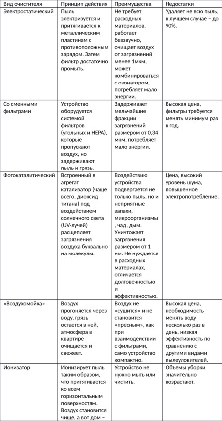 Благодаря достижениям техники, стало возможно усовершенствовать старинный метод «мокрая тряпка и метелочка для пыли». Современный рынок предлагает следующие виды пылеуловителей (представлены в таблице).