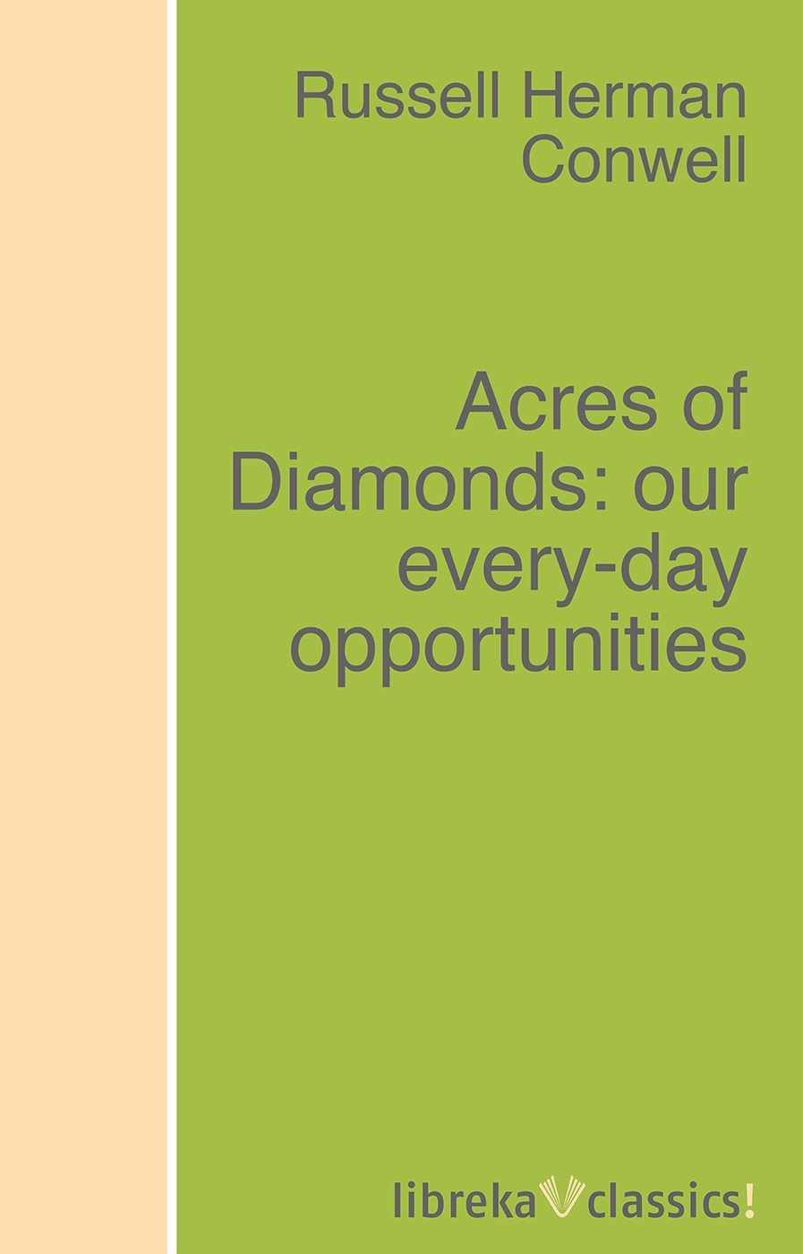 Friends.—This lecture has been delivered under these circumstances: I visit a town or city, and try to arrive there early enough to see the postmaster, the barber, the keeper of the hotel, the principal of the schools, and the ministers of some of the churches, and then go into some of the factories and stores, and talk with the people, and get into sympathy with the local conditions of that town or city and see what has been their history, what opportunities they had, and what they had failed to do—and every town fails to do something—and then go to the lecture and talk to those people about the subjects which applied to their locality. "Acres of Diamonds"—the idea—has continuously been precisely the same. The idea is that in this country of ours every man has the opportunity to make more of himself than he does in his own environment, with his own skill, with his own energy, and with his own friends. RUSSELL H. CONWELL.