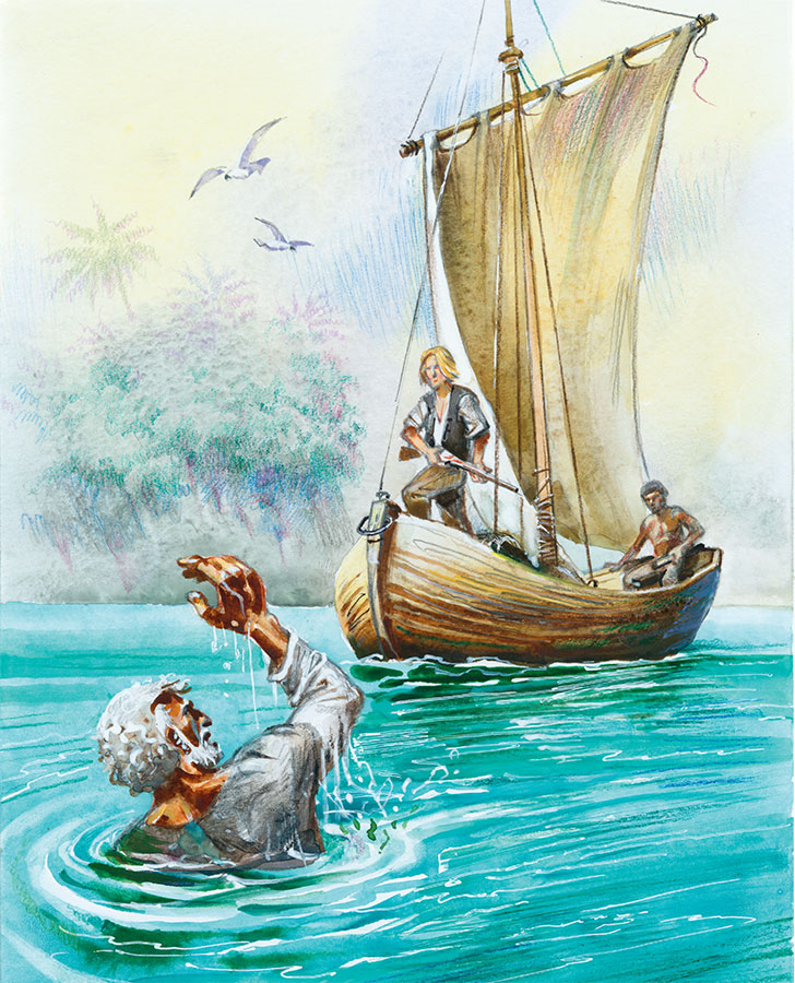 Когда нас отнесло мили на четыре от застрявшего корабля, огромный вал величиной с гору неожиданно набежал с кормы на нашу шлюпку и в один миг опрокинул её. Мы очутились под водой, далеко и от шлюпки, и друг от друга.