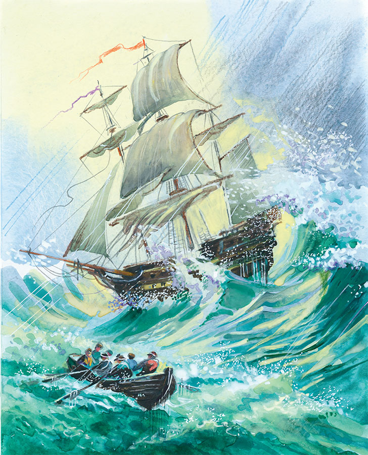 В этот критический момент помощник капитана с помощью остальных членов экипажа перебросил шлюпку через борт; мы все, одиннадцать человек, вошли в неё, отчалили и отдались на волю бушующих волн. Хотя шторм значительно поулёгся, всё-таки на берег набегали страшные валы.