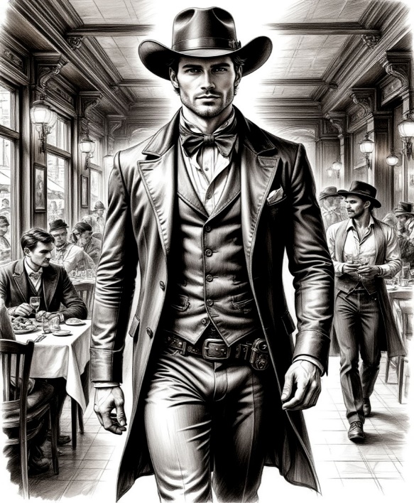 Тут в зале появился новый посетитель. Пока он шел по проходу, все дружно провожали его заинтересованными взглядами. Мужчина был высок, статен, и привлекателен, одет в темно–серый сюртук, такого же цвета брюки, черную рубашку с воротником–стойкой и бабочкой. Вряд ли он смог бы добиться подобного внимания, если бы не одна деталь: явился он в шляпе темно–зеленого цвета с широкими полями, на манер америкосских пастухов, именующих себя ковбоями, ее украшала серая лента. Мне не так часто доводилось видеть мужчин в таких шляпах, если быть точной, это случилось впервые. Цилиндр, котелок, мурмолка29, папаха, малахай30, обычная фетровая шляпа – это пожалуйста, но, чтобы ковбойская, да еще в сочетании с костюмом и в ресторации? Лихо заломленная шляпа делала посетителя похожим на америкосского Дядю Сэма, только сигары в уголке рта не хватало. Занятный тип, конечно, на него стоило посмотреть. Он шел, засунув левую руку в карман брюк, ловко лавируя между столиками. Не удивилась бы, держи он в правой руке кнут или револьвер системы «смит–и–вессон», но парень, похоже, решил, что это будет чересчур. Он благополучно добрался до соседнего столика, подавальщик убрал табличку «Стол заказан» и принес ему меню. Незнакомец углубился в его изучение, а я ядовито подумала, что головной убор он носит потому, что у него наметилась плешь. Шляпу он все–таки снял и небрежно бросил ее на соседний стул, пригладив светло–пепельные волосы. Никакой плеши. Конечно, шляпа шла ему необыкновенно, но он и без нее выглядел хоть куда.