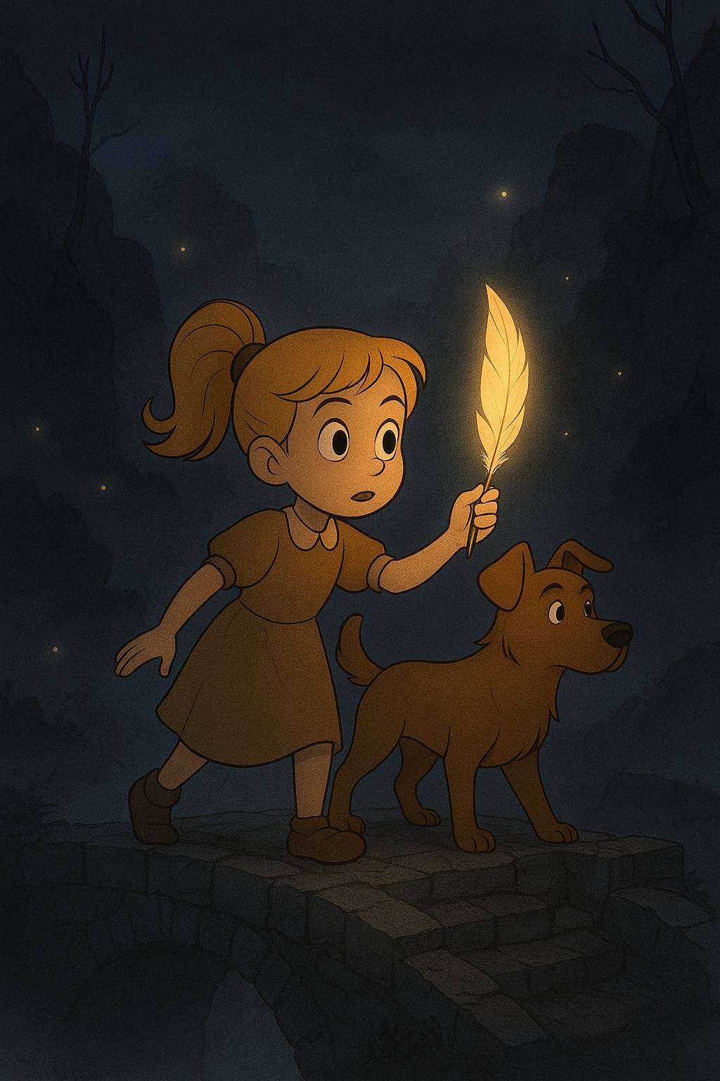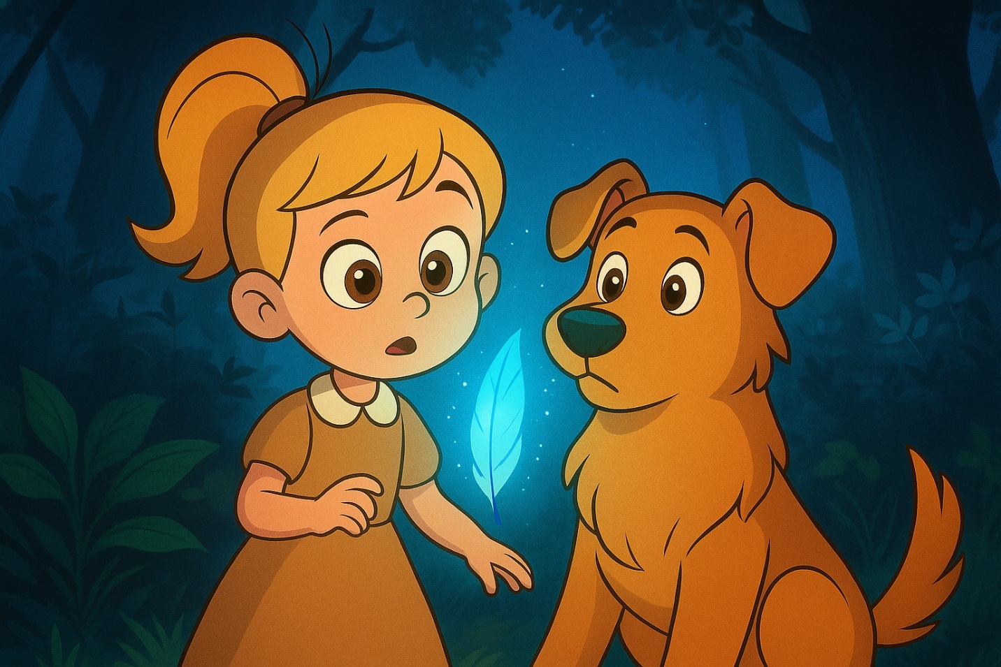 Аврора и Макс шагали по лесной тропинке. В её руке сияло перо, и его мягкий свет указывал дорогу вперёд. Лес вокруг становился всё тише, будто прислушивался к их шагам. Даже ветер замер.
