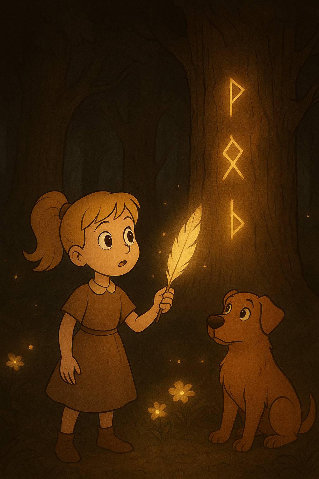 Перо дрогнуло, словно отвечая, и буквы исчезли. И тут впереди послышался шорох. Из густой травы показался необычный зверёк: маленький, пушистый, с огромными ушами и глазами, в которых отражалось небо. Он подошёл ближе и пискнул, словно зовя нас за собой.
