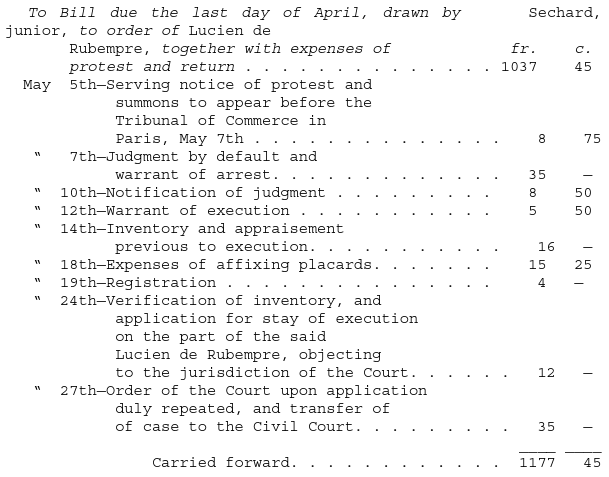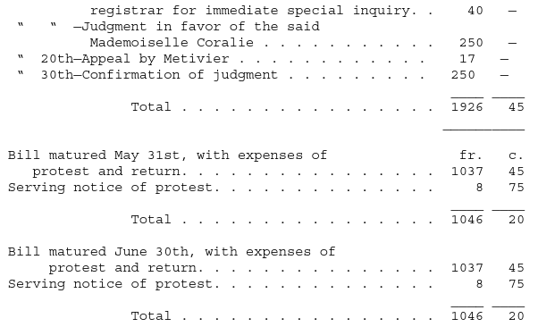 This highly-colored account, therefore, is reduced to the one thousand francs, with an additional thirteen francs for expenses of protest, and half per cent for a month’s delay, one thousand and eighteen francs it may be in all.