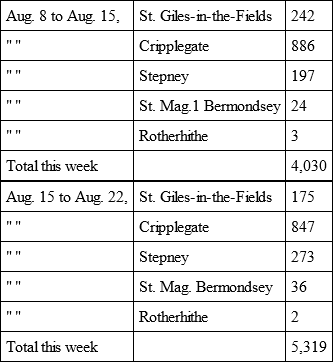 N.B.173– That it was observed that the numbers mentioned in Stepney Parish at that time were generally all on that side where Stepney Parish joined to Shoreditch, which we now call Spittlefields, where the parish of Stepney comes up to the very wall of Shoreditch churchyard. And the plague at this time was abated at St. Giles-in-the-Fields, and raged most violently in Cripplegate, Bishopsgate, and Shoreditch Parishes, but there were not ten people a week that died of it in all that part of Stepney Parish which takes in Limehouse, Ratcliff Highway, and which are now the parishes of Shadwell and Wapping, even to St. Katherine's-by-the-Tower, till after the whole month of August was expired; but they paid for it afterwards, as I shall observe by and by.