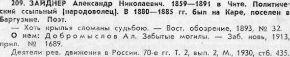 К этой статье приложен обширный список прошлых публикаций (до 1927 г.) со сведениями о А. Н. Зайднере, который открывают статьи и книги бывшего политического ссыльного Л. Г. Дейча. Среди них, изданная в Женеве в 1905 г., книга «16 лет в Сибири"4а, в которой о Зайднере помещены такие сведения: «52) Зайднер, Александр, род. в 59 г. в Мелитополе, купеч. внук, еврей, воспит. в Никол. реальн. учил. (не к.), ар. в 78 г., одесск. военный суд (по делу Чубарова и др.) на 10 л., прибыл в 80 г. в Забайкальску обл., по маниф. сбавлена треть, устроил там публичн. библиотеку, умер там же в 92 г.».