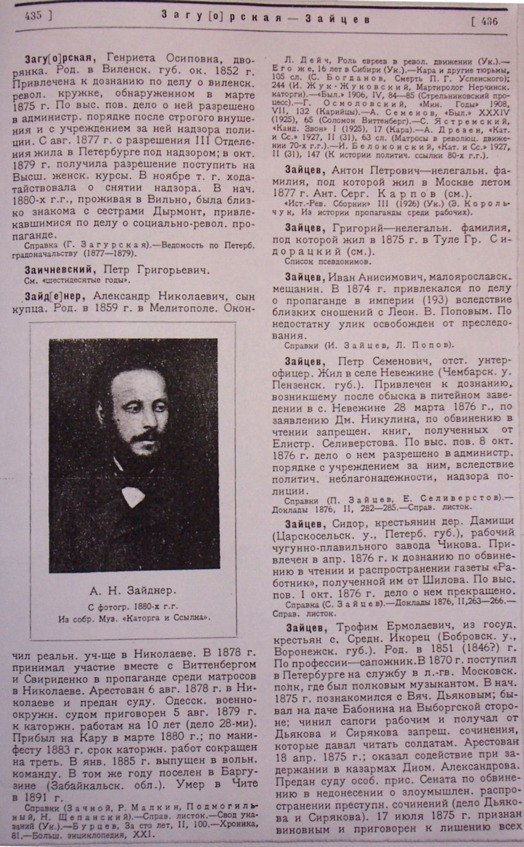 Приведём теперь краткую статью4 о самом Зайднере с его фотографией 1880-х гг. из указанного здесь Петряевым источника – Био-библиографического словаря «Деятели революционного движения в России», охватывающего период «от предшественников декабристов до падения царизма» (Семидесятые годы), изданного в 1930 г. под эгидой «Всесоюзного общества политических каторжан и ссыльно-поселенцев». Вот её строки: «Зайд [е] нер Александр Николаевич, сын купца. Род. в 1859 г., в Мелитополе. Окончил реальн. уч.-ще в Николаеве. В 1878 г. принимал участие вместе с Виттенбергом и Свириденко в пропаганде среди матросов в Николаеве. Арестован 6 авг. 1878 г. в Николаеве и предан суду. Одеск. военно-окружн. судом приговорен 8 авг. 1879 г. к каторжным работам на 10 лет (дело 28-ми). Прибыл на каторгу в марте 1880 г.; по манифесту 1883 г. срок каторжн. работ сокращен на треть. В янв. 1885 г. выпущен в вольн. команду. В том же году поселен в Баргузине… Умер в Чите в 1891 г. [здесь и далее выделение. – авт.]».