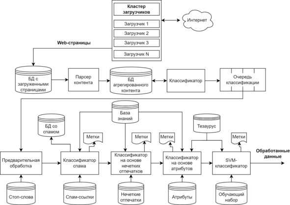 Система, показанная на рисунке 2, состоит из кластера загрузчиков контента [100], т. е. веб-краулеров, модуля парсинга контента, модуля классификации, модуля предварительной обработки, классификатора спама, классификатора на основе нечетких отпечатков, классификатора на основе атрибутов и SVM-классификатора.